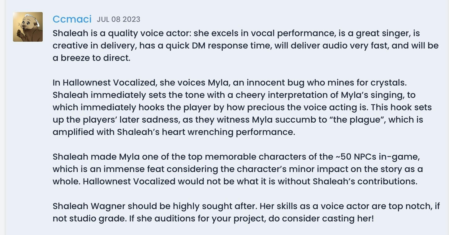 Shaleah (SAG-E) has lent her voice to a variety of projects from video games to indie cartoons and everything in between.